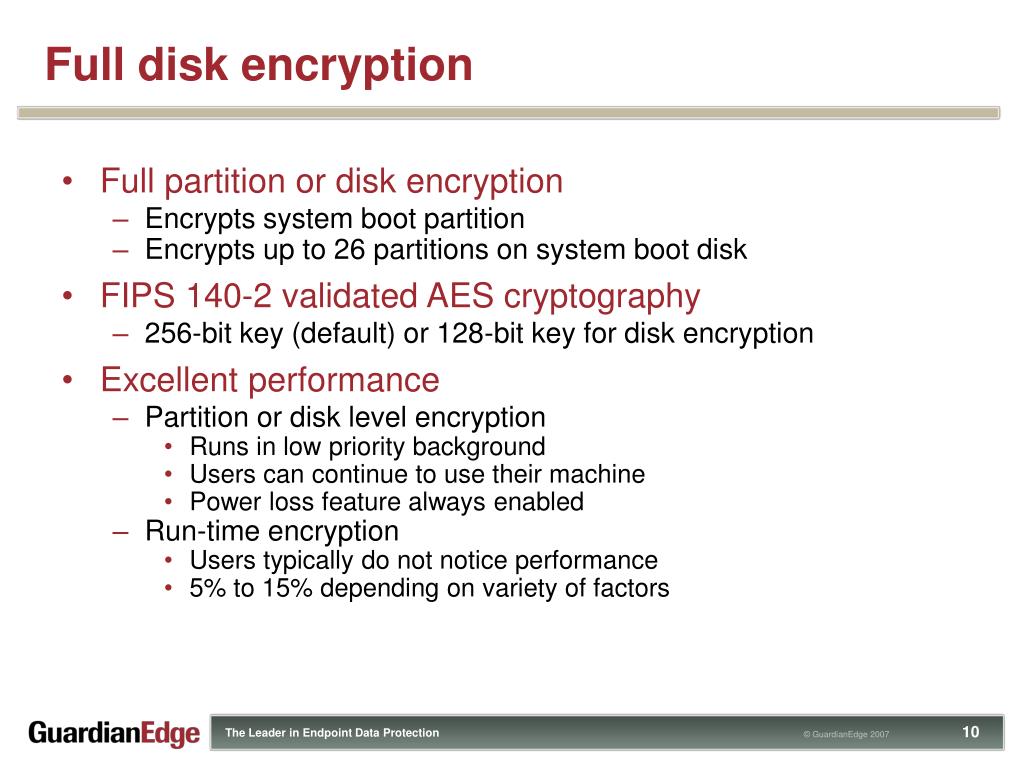 Full disk encryption • Full partition or disk encryption • Encrypts system boot partition • Encrypts up to 26 partitions on system boot disk • FIPS 140-2 validated AES cryptography • 256-bit key (default) or 128-bit key for disk encryption • Excellent performance • Partition or disk level encryption • Runs in low priority background • Users can continue to use their machine • Power loss feature always enabled • Run-time encryption • Users typically do not notice performance • 5% to 15% depending on variety of factors The Leader in Endpoint Data Protection