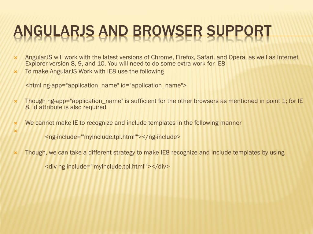 AngularJS will work with the latest versions of Chrome, Firefox, Safari, and Opera, as well as Internet Explorer version 8, 9, and 10. You will need to do some extra work for IE8 To make AngularJS Work with IE8 use the following <html ng-app="application_name" id="application_name"> Though ng-app="application_name" is sufficient for the other browsers as mentioned in point 1; for IE 8, id attribute is also required We cannot make IE to recognize and include templates in the following manner <ng-include="'myInclude.tpl.html'"></ng-include> Though, we can take a different strategy to make IE8 recognize and include templates by using <div ng-include="'myInclude.tpl.html'"></div> AngularJS and Browser Support