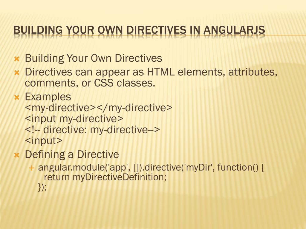 Building Your Own Directives • Directives can appear as HTML elements, attributes, comments, or CSS classes. • Examples<my-directive></my-directive><input my-directive><!-- directive: my-directive--><input> • Defining a Directive • angular.module('app', []).directive('myDir', function() { return myDirectiveDefinition;}); Building Your Own Directives in AngularJS