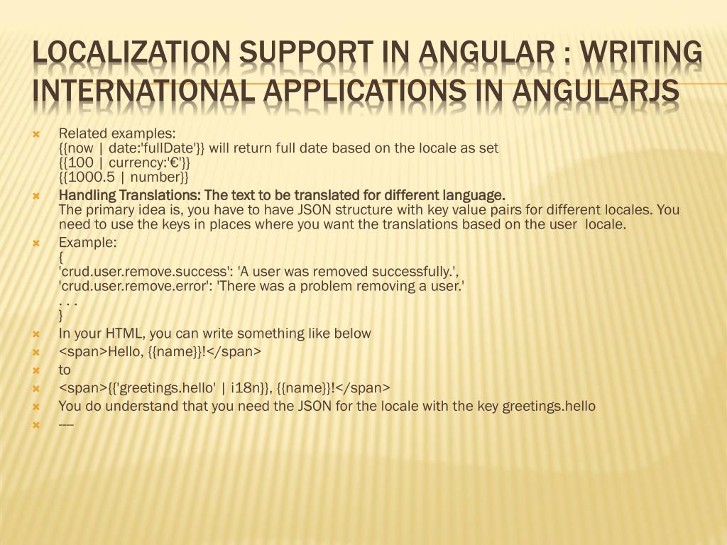 Related examples:{{now | date:'fullDate'}} will return full date based on the locale as set{{100 | currency:'€'}}{{1000.5 | number}} Handling Translations: The text to be translated for different language.The primary idea is, you have to have JSON structure with key value pairs for different locales. You need to use the keys in places where you want the translations based on the user locale. Example:{'crud.user.remove.success': 'A user was removed successfully.','crud.user.remove.error': 'There was a problem removing a user.'. . .} In your HTML, you can write something like below <span>Hello, {{name}}!</span> to <span>{{'greetings.hello' | i18n}}, {{name}}!</span> You do understand that you need the JSON for the locale with the key greetings.hello ---- Localization Support in Angular : Writing International Applications in AngularJS