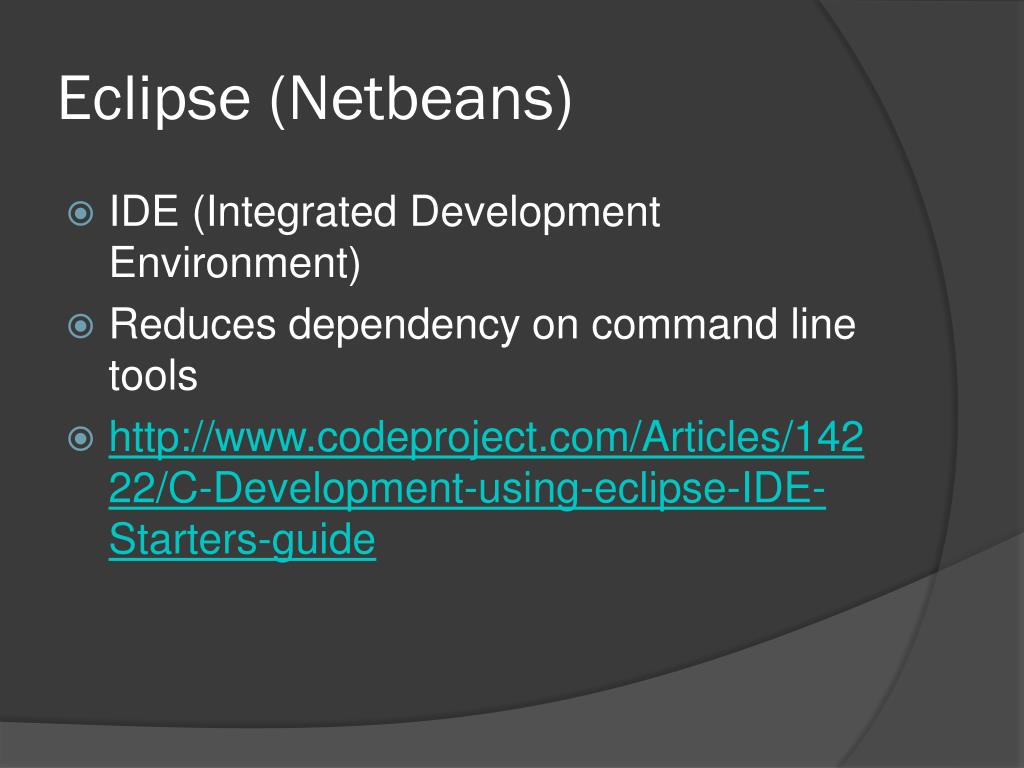 Eclipse (Netbeans) • IDE (Integrated Development Environment) • Reduces dependency on command line tools • http://www.codeproject.com/Articles/14222/C-Development-using-eclipse-IDE-Starters-guide