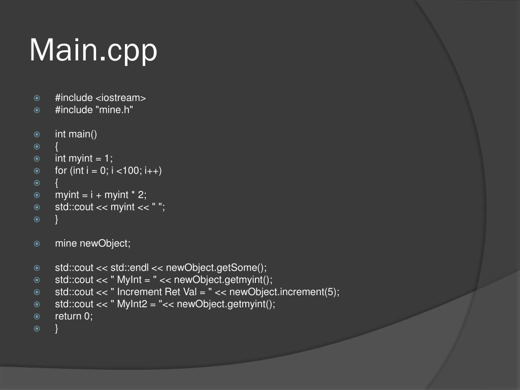 Main.cpp • #include <iostream> • #include "mine.h" • int main() • { • intmyint = 1; • for (int i = 0; i <100; i++) • { • myint = i + myint * 2; • std::cout << myint << " "; • } • mine newObject; • std::cout << std::endl << newObject.getSome(); • std::cout << " MyInt = " << newObject.getmyint(); • std::cout << " Increment Ret Val = " << newObject.increment(5); • std::cout << " MyInt2 = "<< newObject.getmyint(); • return 0; • }