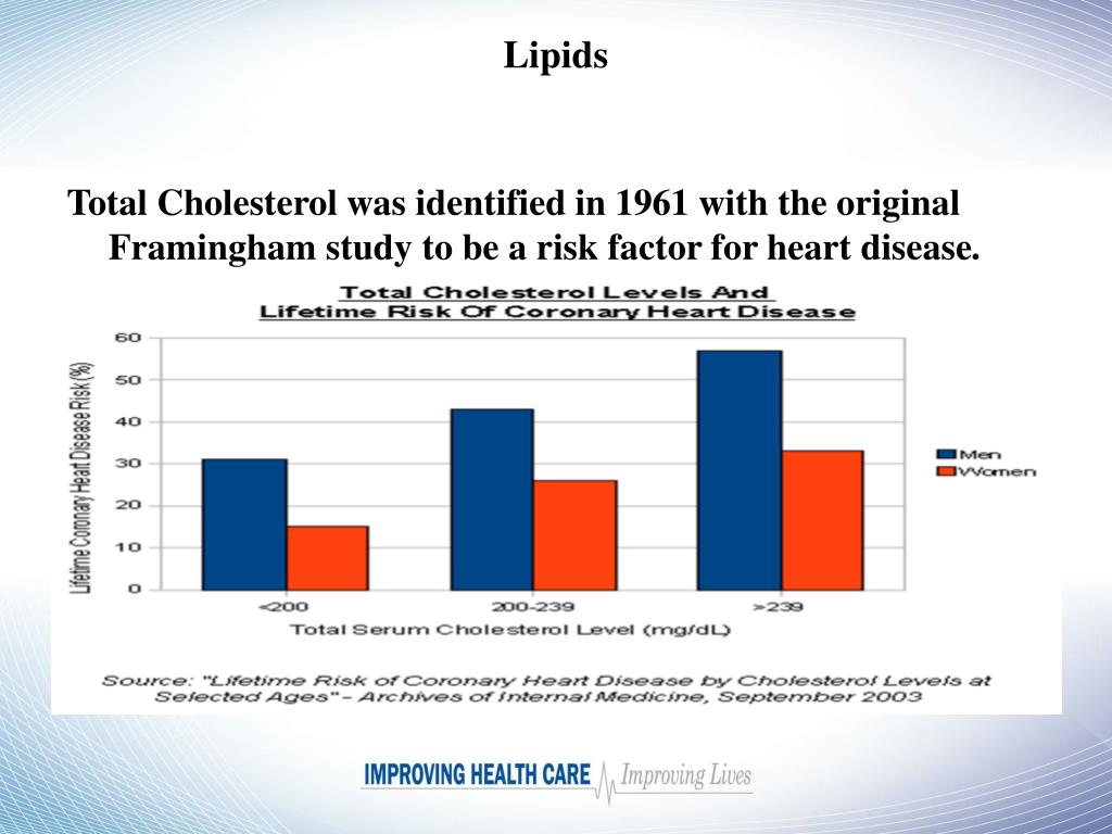Lipids Total Cholesterol was identified in 1961 with the original Framingham study to be a risk factor for heart disease.