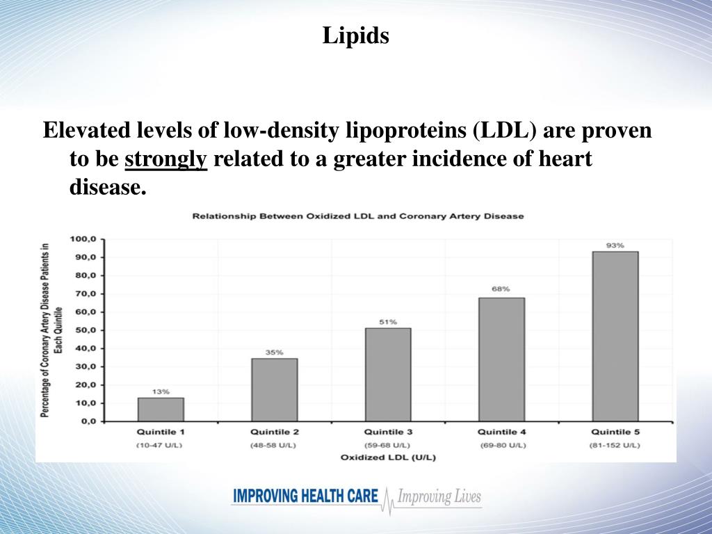 Lipids Elevated levels of low-density lipoproteins (LDL) are proven to be strongly related to a greater incidence of heart disease.
