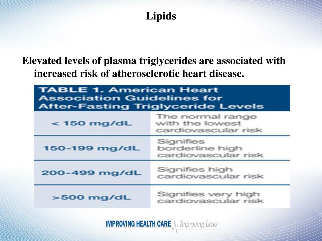 Lipids Elevated levels of plasma triglycerides are associated with increased risk of atherosclerotic heart disease.