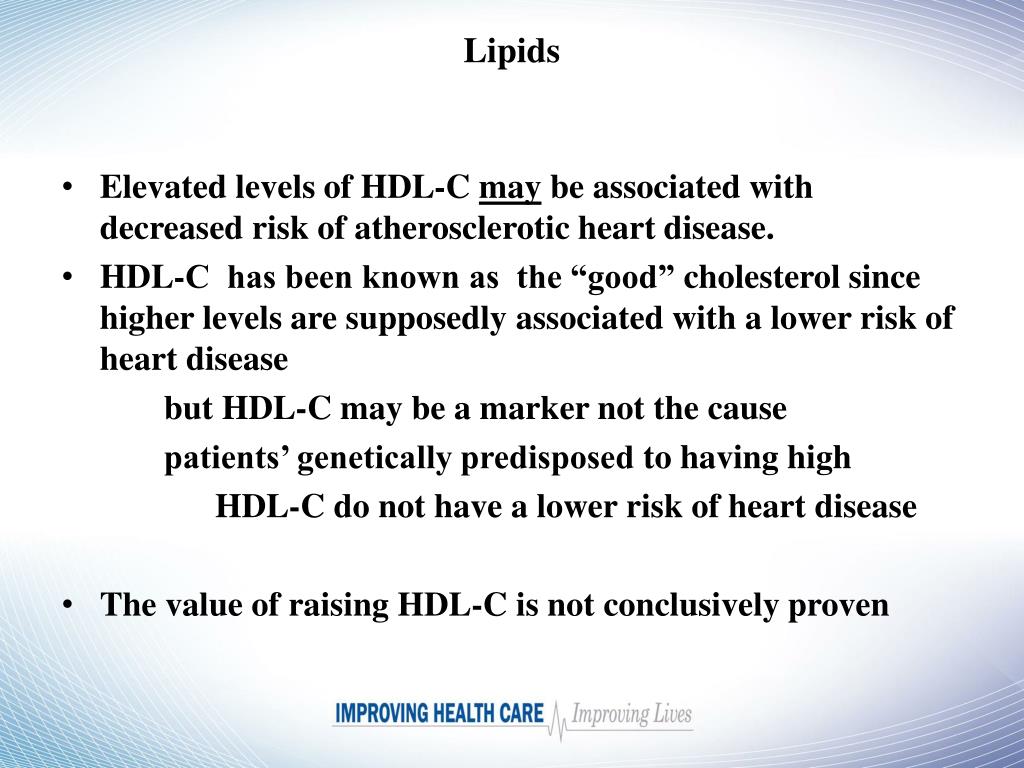 Lipids • Elevated levels of HDL-C may be associated with decreased risk of atherosclerotic heart disease. • HDL-C has been known as the “good” cholesterol since higher levels are supposedly associated with a lower risk of heart disease but HDL-C may be a marker not the cause patients’ genetically predisposed to having high HDL-C do not have a lower risk of heart disease • The value of raising HDL-C is not conclusively proven