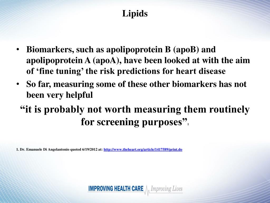 Lipids • Biomarkers, such as apolipoprotein B (apoB) and apolipoprotein A (apoA), have been looked at with the aim of ‘fine tuning’ the risk predictions for heart disease • So far, measuring some of these other biomarkers has not been very helpful “it is probably not worth measuring them routinely for screening purposes”1 1. Dr. Emanuele Di Angelantonio quoted 6/19/2012 at: http://www.theheart.org/article/1417589/print.do