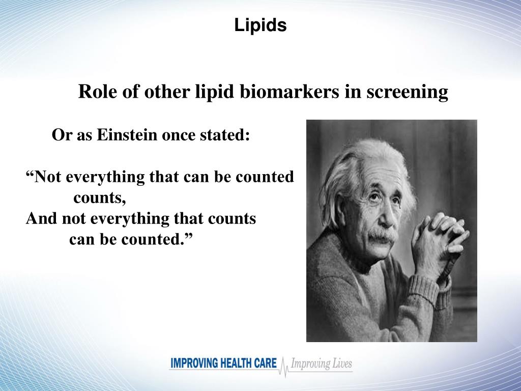 Lipids Role of other lipid biomarkers in screening Or as Einstein once stated: “Not everything that can be counted counts, And not everything that counts can be counted.”
