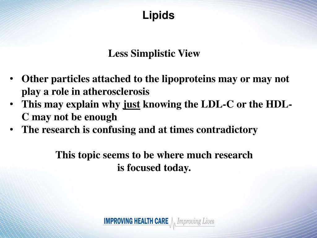 Lipids • Less Simplistic View • Other particles attached to the lipoproteins may or may not play a role in atherosclerosis • This may explain why just knowing the LDL-C or the HDL-C may not be enough • The research is confusing and at times contradictory • This topic seems to be where much research • is focused today.