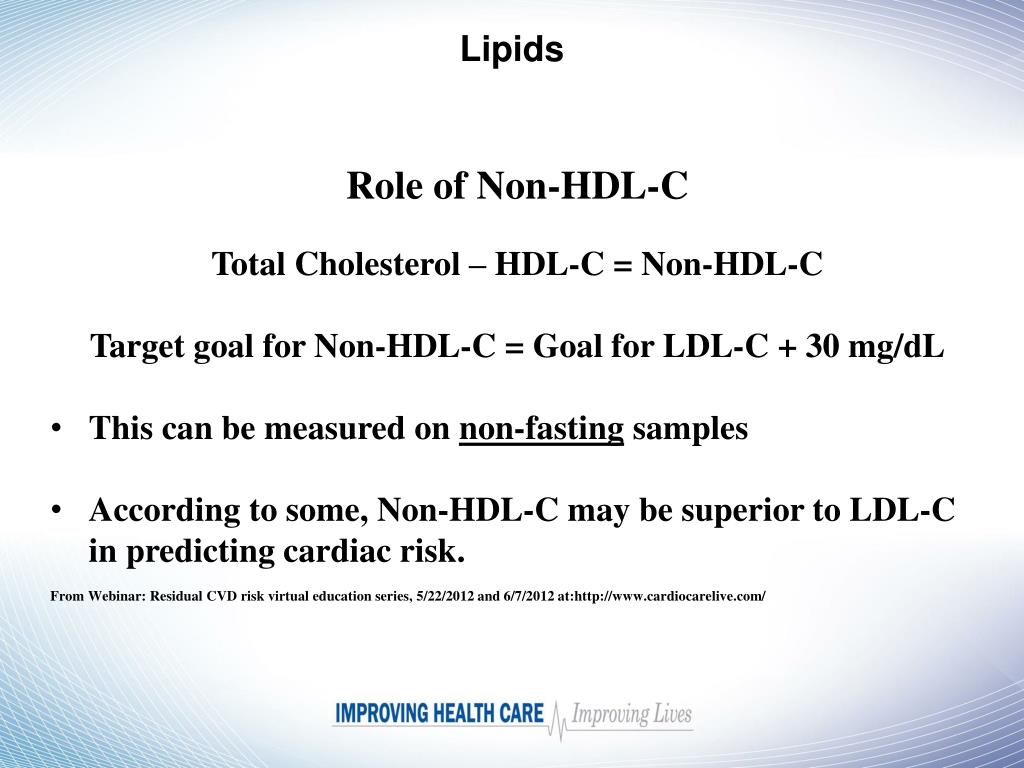 Lipids • Role of Non-HDL-C • Total Cholesterol – HDL-C = Non-HDL-C • Target goal for Non-HDL-C = Goal for LDL-C + 30 mg/dL • This can be measured on non-fasting samples • According to some, Non-HDL-C may be superior to LDL-C in predicting cardiac risk. • From Webinar: Residual CVD risk virtual education series, 5/22/2012 and 6/7/2012 at:http://www.cardiocarelive.com/