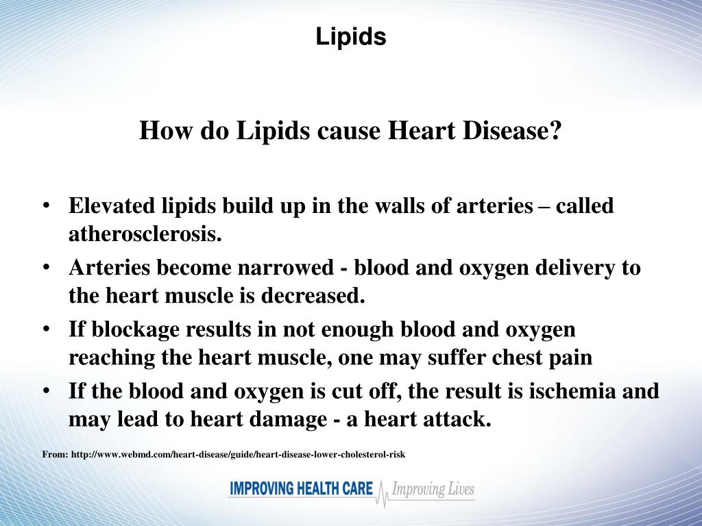 Lipids How do Lipids cause Heart Disease? • Elevated lipids build up in the walls of arteries – called atherosclerosis. • Arteries become narrowed - blood and oxygen delivery to the heart muscle is decreased. • If blockage results in not enough blood and oxygen reaching the heart muscle, one may suffer chest pain • If the blood and oxygen is cut off, the result is ischemia and may lead to heart damage - a heart attack. From: http://www.webmd.com/heart-disease/guide/heart-disease-lower-cholesterol-risk