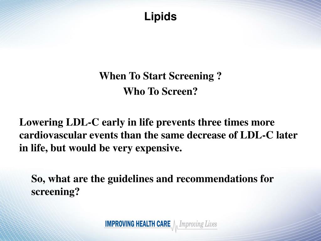 Lipids When To Start Screening ? Who To Screen? Lowering LDL-C early in life prevents three times more cardiovascular events than the same decrease of LDL-C later in life, but would be very expensive. So, what are the guidelines and recommendations for screening?
