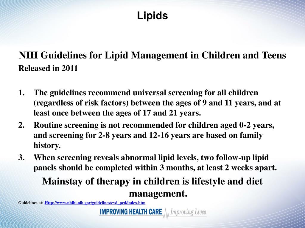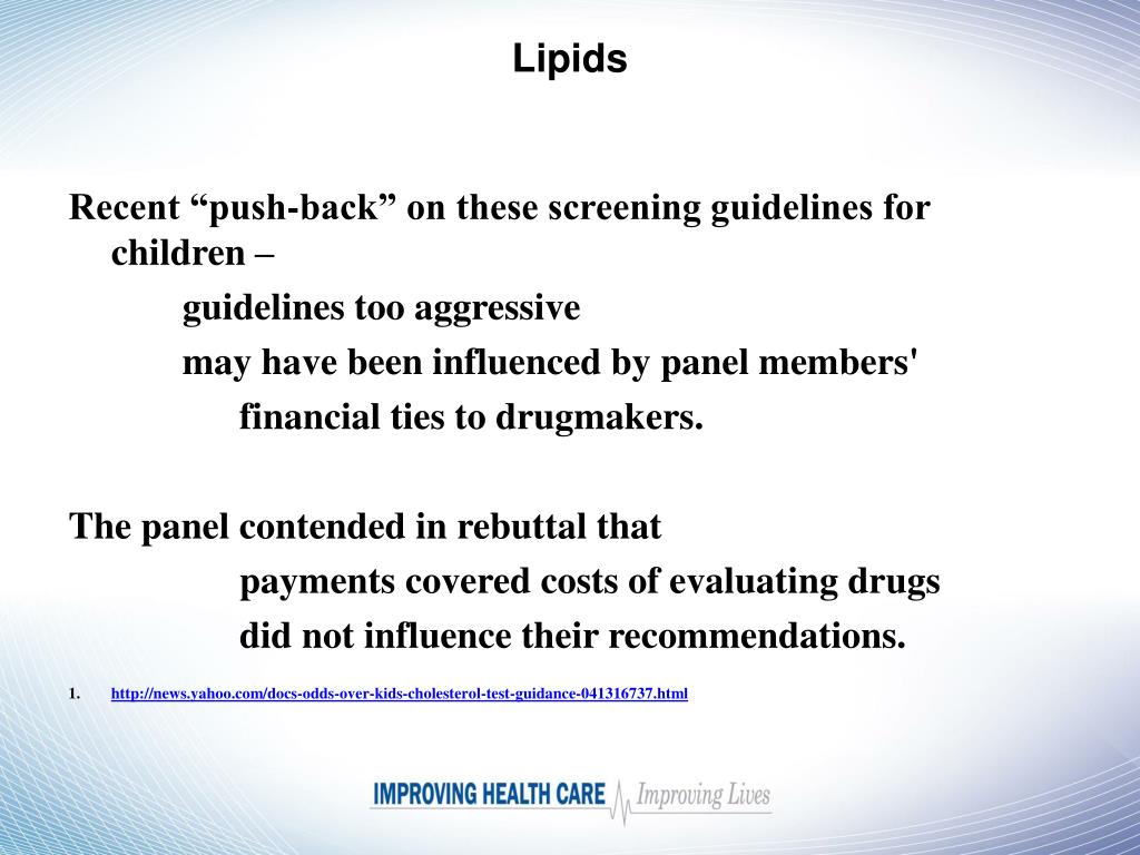 Lipids Recent “push-back” on these screening guidelines for children – guidelines too aggressive may have been influenced by panel members' financial ties to drugmakers. The panel contended in rebuttal that payments covered costs of evaluating drugs did not influence their recommendations. • http://news.yahoo.com/docs-odds-over-kids-cholesterol-test-guidance-041316737.html