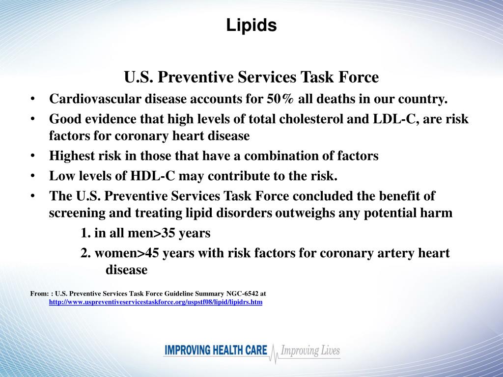 Lipids Final U.S.P.ST.F. recommendations: • Recommends screening all men aged 20 to 35 years for lipid disorders if they are at increased risk for coronary heart disease • Strongly recommends screening all men aged 35 and older for lipid disorders. • Recommends screening women aged 20 to 45 years for lipid disorders if they are at increased risk for coronary heart disease • Strongly recommends screening women aged 45 and older for lipid disorders if they are at increased risk for coronary heart disease • Optimal screening interval – recommends 5 years – this becomes less important after age 65 years. From: U.S. Preventive Services Task Force Guideline Summary NGC-6542 at http://www.uspreventiveservicestaskforce.org/uspstf08/lipid/lipidrs.htm
