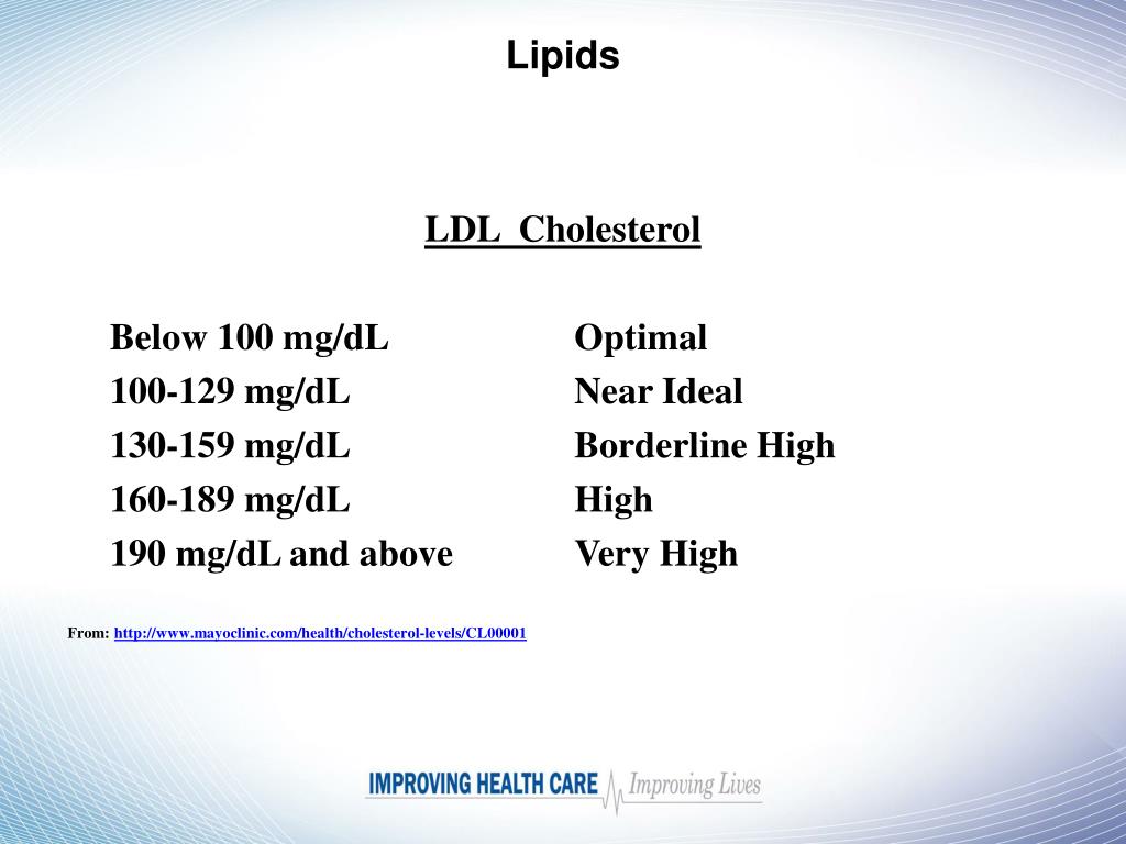 Lipids LDL Cholesterol Below 100 mg/dL Optimal 100-129 mg/dL Near Ideal 130-159 mg/dL Borderline High 160-189 mg/dL High 190 mg/dL and above Very High From: http://www.mayoclinic.com/health/cholesterol-levels/CL00001