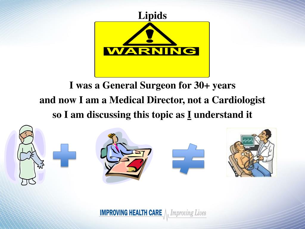 Lipids I was a General Surgeon for 30+ years and now I am a Medical Director, not a Cardiologist so I am discussing this topic as I understand it