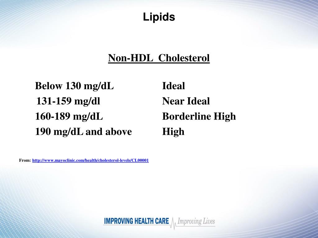 Lipids Non-HDL Cholesterol Below 130 mg/dL Ideal 131-159 mg/dl Near Ideal 160-189 mg/dL Borderline High 190 mg/dL and above High From: http://www.mayoclinic.com/health/cholesterol-levels/CL00001