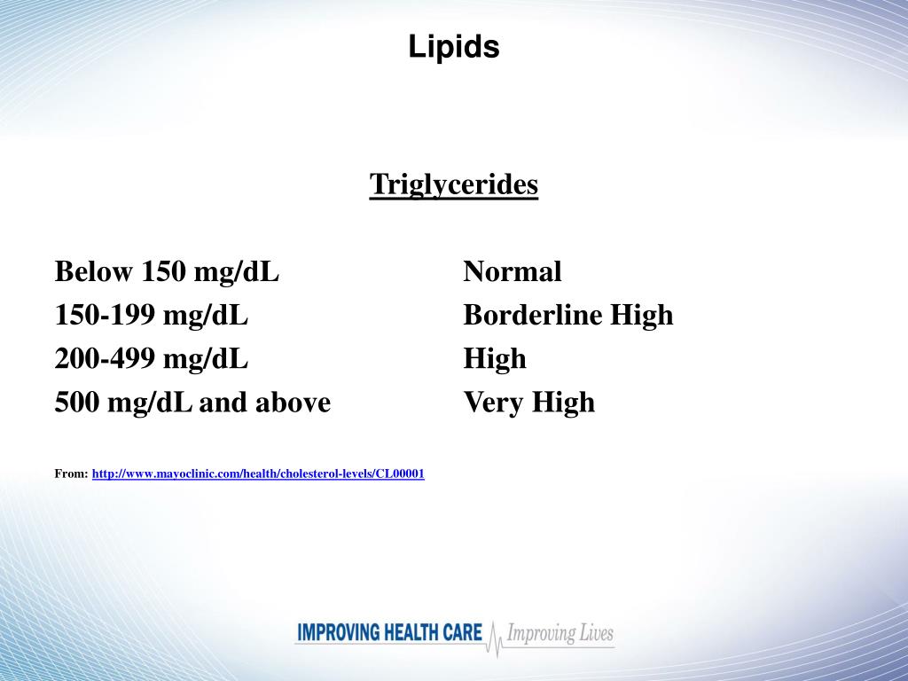 Lipids Triglycerides Below 150 mg/dL Normal 150-199 mg/dL Borderline High 200-499 mg/dL High 500 mg/dL and above Very High From: http://www.mayoclinic.com/health/cholesterol-levels/CL00001