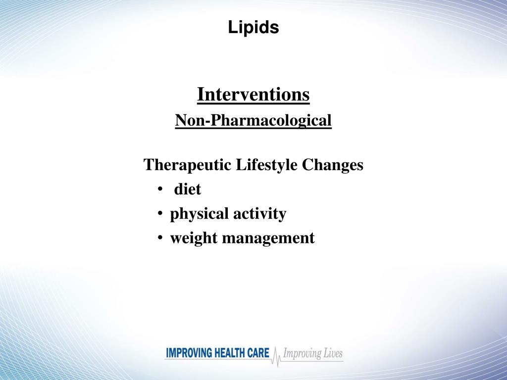 Lipids Interventions Non-Pharmacological Therapeutic Lifestyle Changes • diet • physical activity • weight management