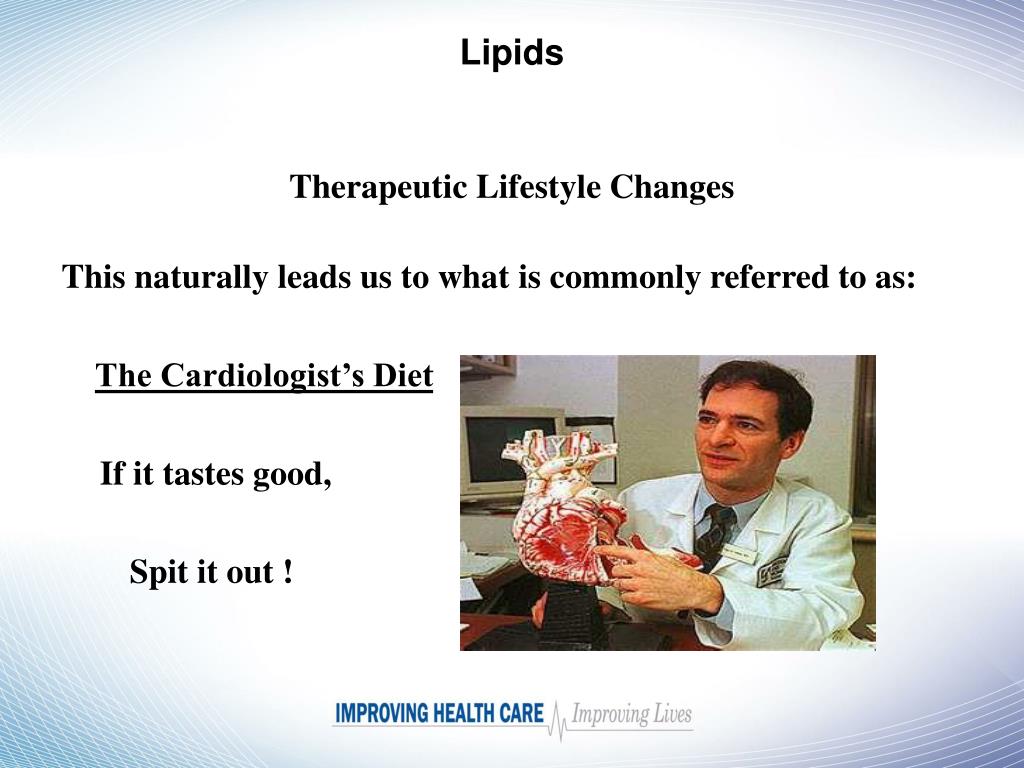 Lipids Therapeutic Lifestyle Changes This naturally leads us to what is commonly referred to as: The Cardiologist’s Diet If it tastes good, Spit it out !