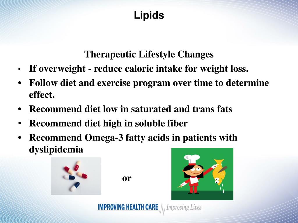 Lipids Therapeutic Lifestyle Changes • If overweight - reduce caloric intake for weight loss. • Follow diet and exercise program over time to determine effect. • Recommend diet low in saturated and trans fats • Recommend diet high in soluble fiber •Recommend Omega-3 fatty acids in patients with dyslipidemia or