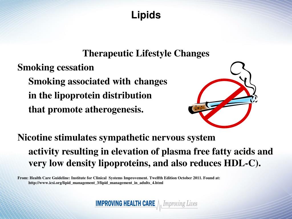 Lipids Therapeutic Lifestyle Changes Smoking cessation Smoking associated with changes in the lipoprotein distribution that promote atherogenesis. Nicotine stimulates sympathetic nervous system activity resulting in elevation of plasma free fatty acids and very low density lipoproteins, and also reduces HDL-C). From: Health Care Guideline: Institute for Clinical Systems Improvement. Twelfth Edition October 2011. Found at: http://www.icsi.org/lipid_management_3/lipid_management_in_adults_4.html