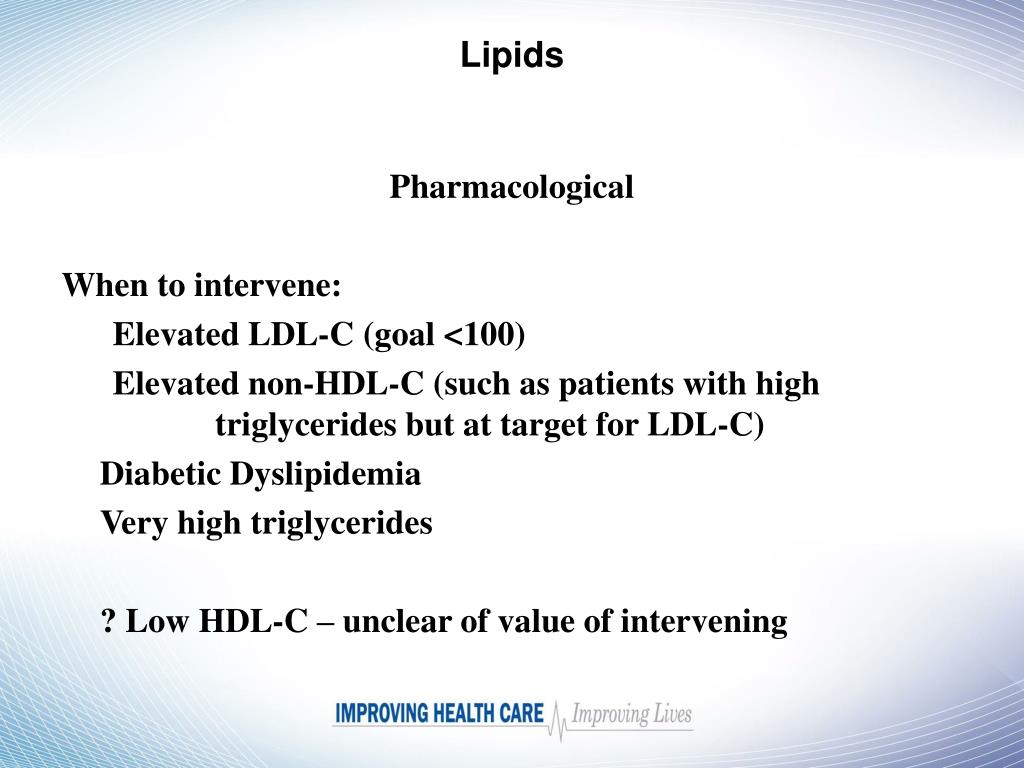 Lipids Pharmacological When to intervene: Elevated LDL-C (goal <100) Elevated non-HDL-C (such as patients with high triglycerides but at target for LDL-C) Diabetic Dyslipidemia Very high triglycerides ? Low HDL-C – unclear of value of intervening