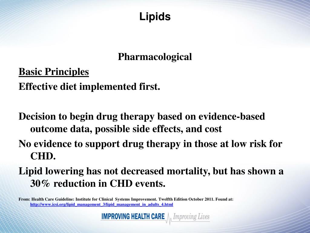 Lipids Pharmacological Basic Principles Effective diet implemented first. Decision to begin drug therapy based on evidence-based outcome data, possible side effects, and cost No evidence to support drug therapy in those at low risk for CHD. Lipid lowering has not decreased mortality, but has shown a 30% reduction in CHD events. From: Health Care Guideline: Institute for Clinical Systems Improvement. Twelfth Edition October 2011. Found at: http://www.icsi.org/lipid_management_3/lipid_management_in_adults_4.html