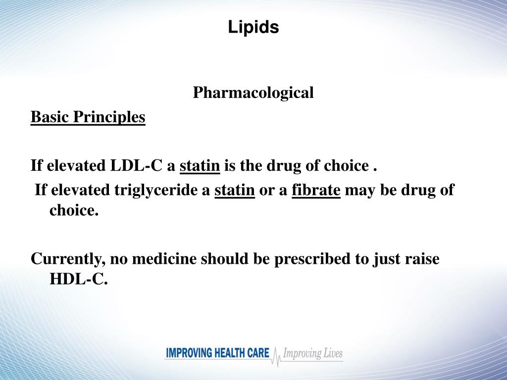 Lipids Pharmacological Basic Principles If elevated LDL-C a statin is the drug of choice . If elevated triglyceride a statin or a fibrate may be drug of choice. Currently, no medicine should be prescribed to just raise HDL-C.