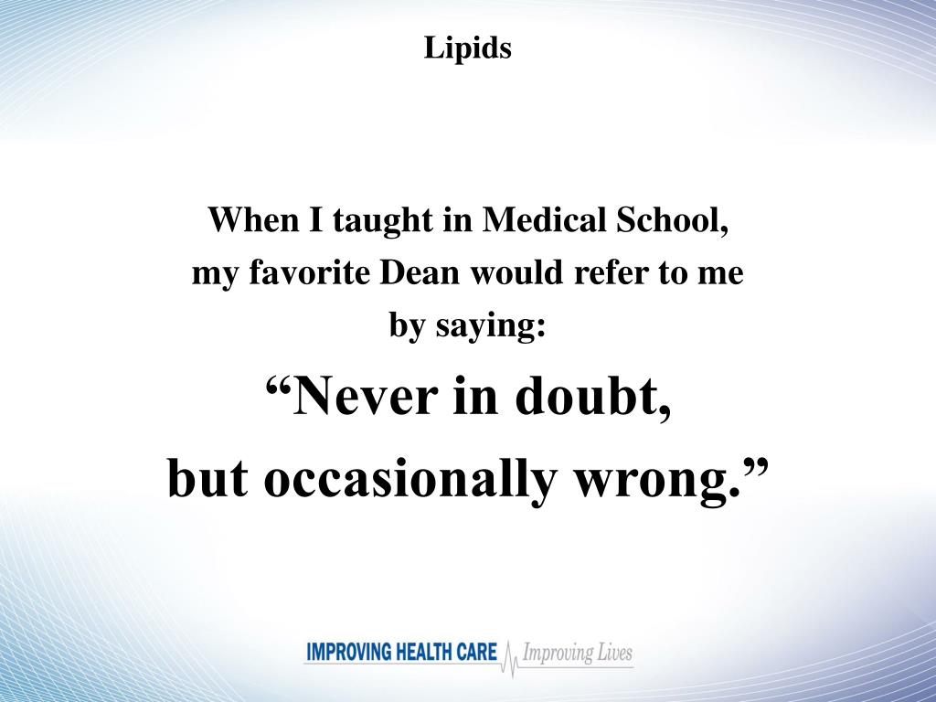 Lipids When I taught in Medical School, my favorite Dean would refer to me by saying: “Never in doubt, but occasionally wrong.”