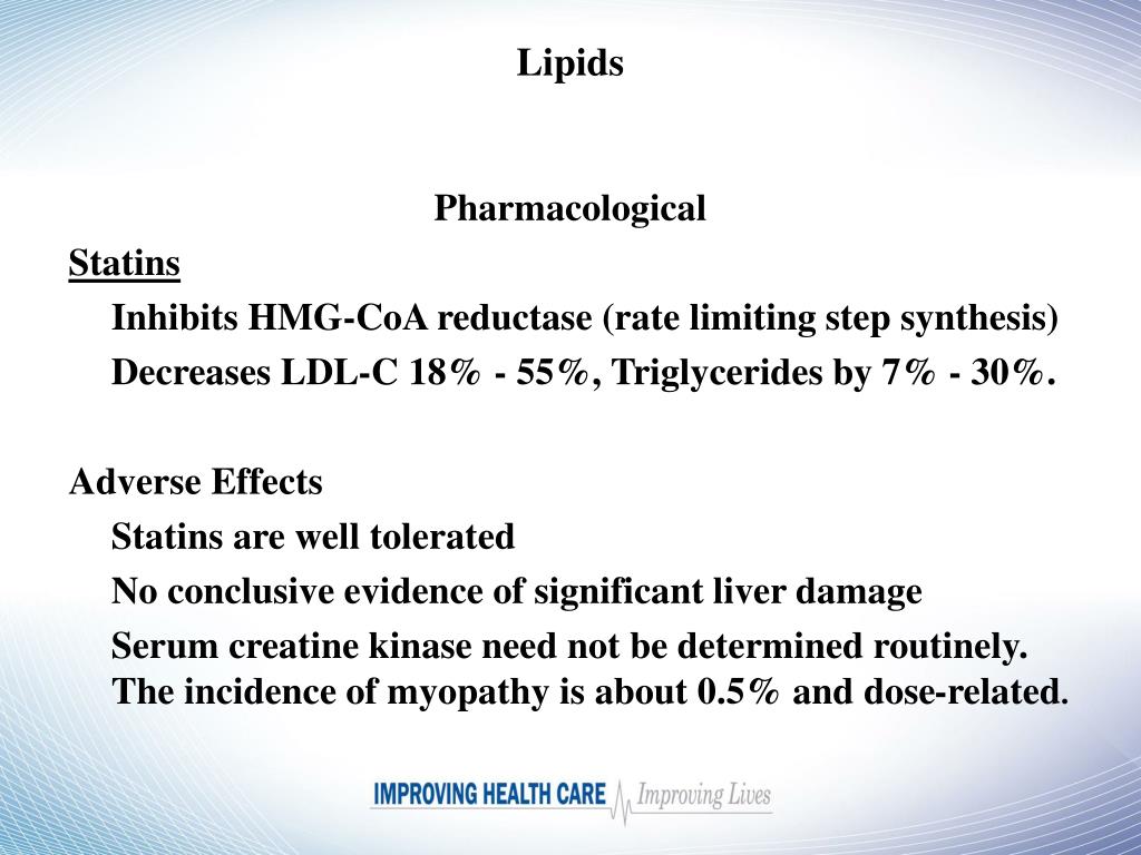 Lipids Pharmacological Statins Inhibits HMG-CoAreductase (rate limiting step synthesis) Decreases LDL-C 18% - 55%, Triglycerides by 7% - 30%. Adverse Effects Statins are well tolerated No conclusive evidence of significant liver damage Serum creatine kinase need not be determined routinely. The incidence of myopathy is about 0.5% and dose-related.
