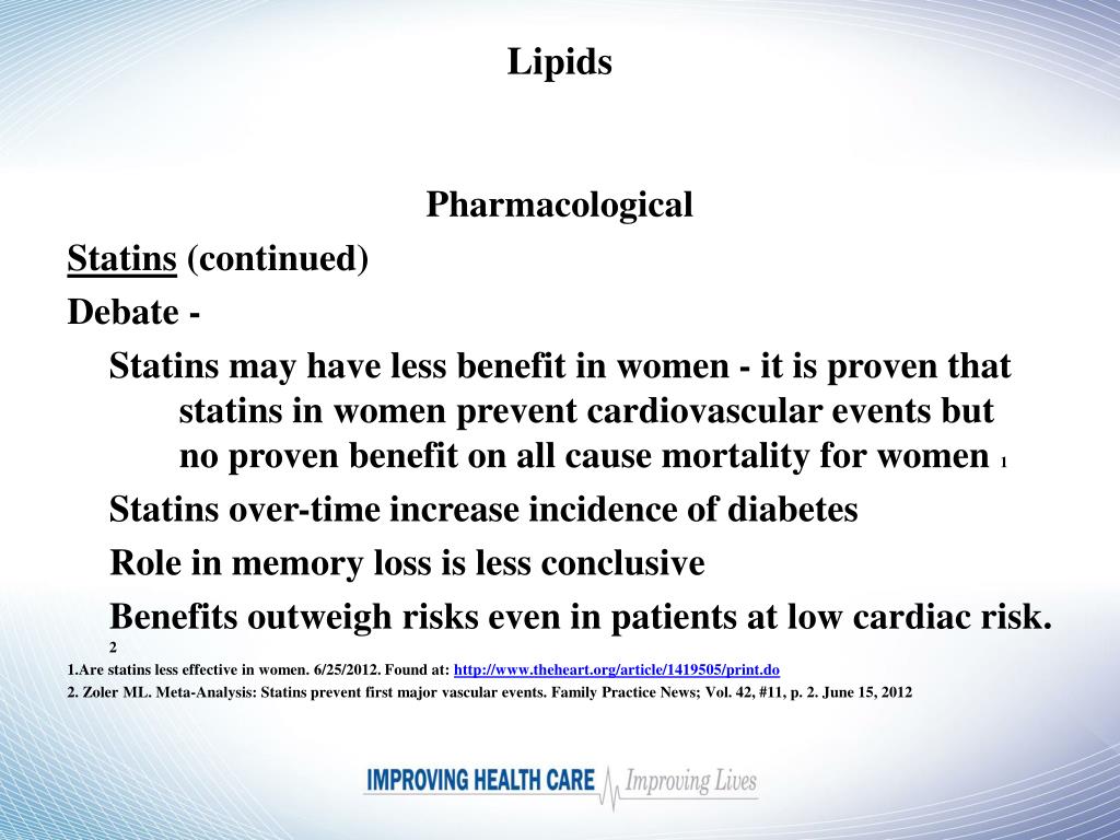 Lipids Pharmacological Statins (continued) Debate - Statins may have less benefit in women - it is proven that statins in women prevent cardiovascular events but no proven benefit on all cause mortality for women 1 Statins over-time increase incidence of diabetes Role in memory loss is less conclusive Benefits outweigh risks even in patients at low cardiac risk. 2 1.Are statins less effective in women. 6/25/2012. Found at: http://www.theheart.org/article/1419505/print.do 2. Zoler ML. Meta-Analysis: Statins prevent first major vascular events. Family Practice News; Vol. 42, #11, p. 2. June 15, 2012