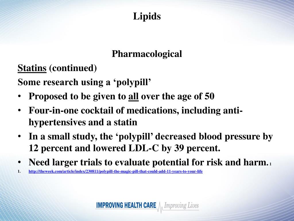 Lipids Pharmacological Statins (continued) Some research using a ‘polypill’ • Proposed to be given to all over the age of 50 • Four-in-one cocktail of medications, including anti-hypertensives and a statin • In a small study, the ‘polypill’ decreased blood pressure by 12 percent and lowered LDL-C by 39 percent. • Need larger trials to evaluate potential for risk and harm. 1 • http://theweek.com/article/index/230811/polypill-the-magic-pill-that-could-add-11-years-to-your-life