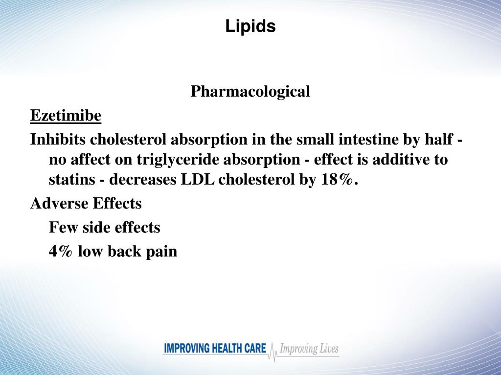 Lipids Pharmacological Ezetimibe Inhibits cholesterol absorption in the small intestine by half - no affect on triglyceride absorption - effect is additive to statins - decreases LDL cholesterol by 18%. Adverse Effects Few side effects 4% low back pain