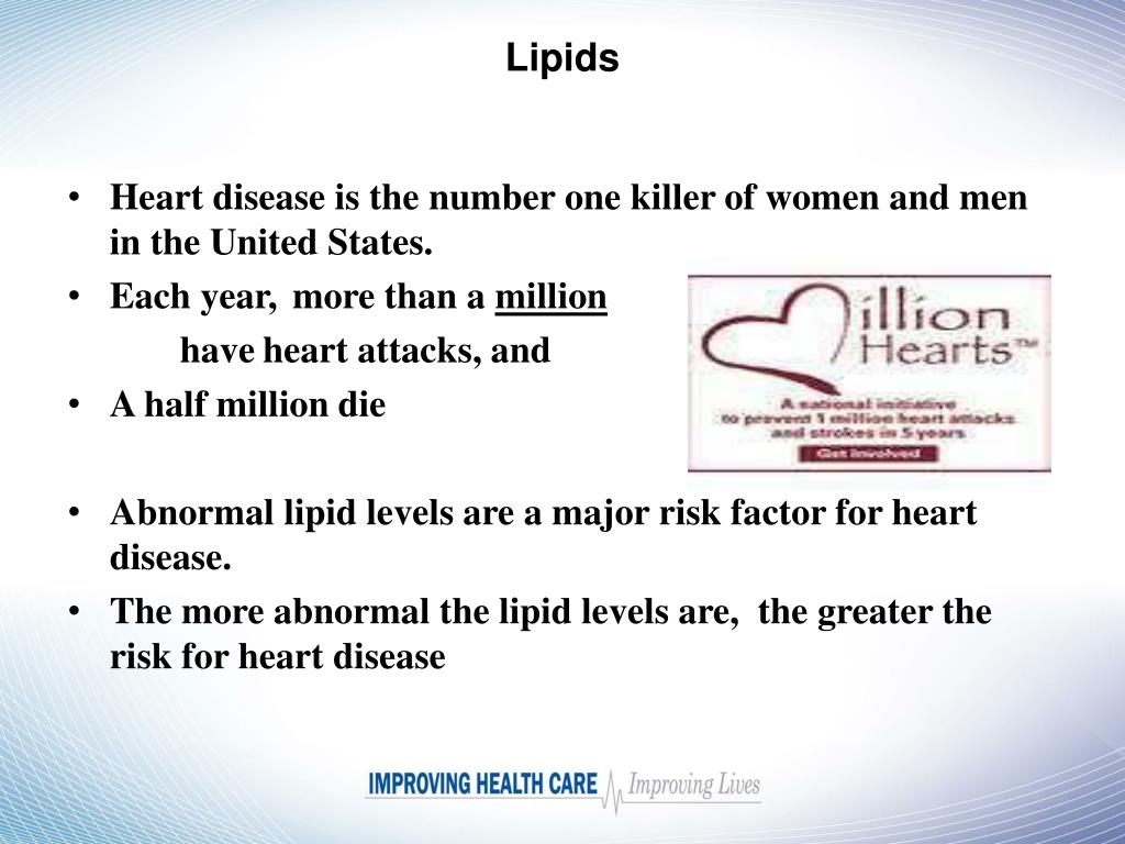 Lipids • Heart disease is the number one killer of women and men in the United States. • Each year, more than a million haveheart attacks, and • A half million die • Abnormal lipid levels are a major risk factor for heart disease. • The more abnormal the lipid levels are, the greater the risk for heart disease