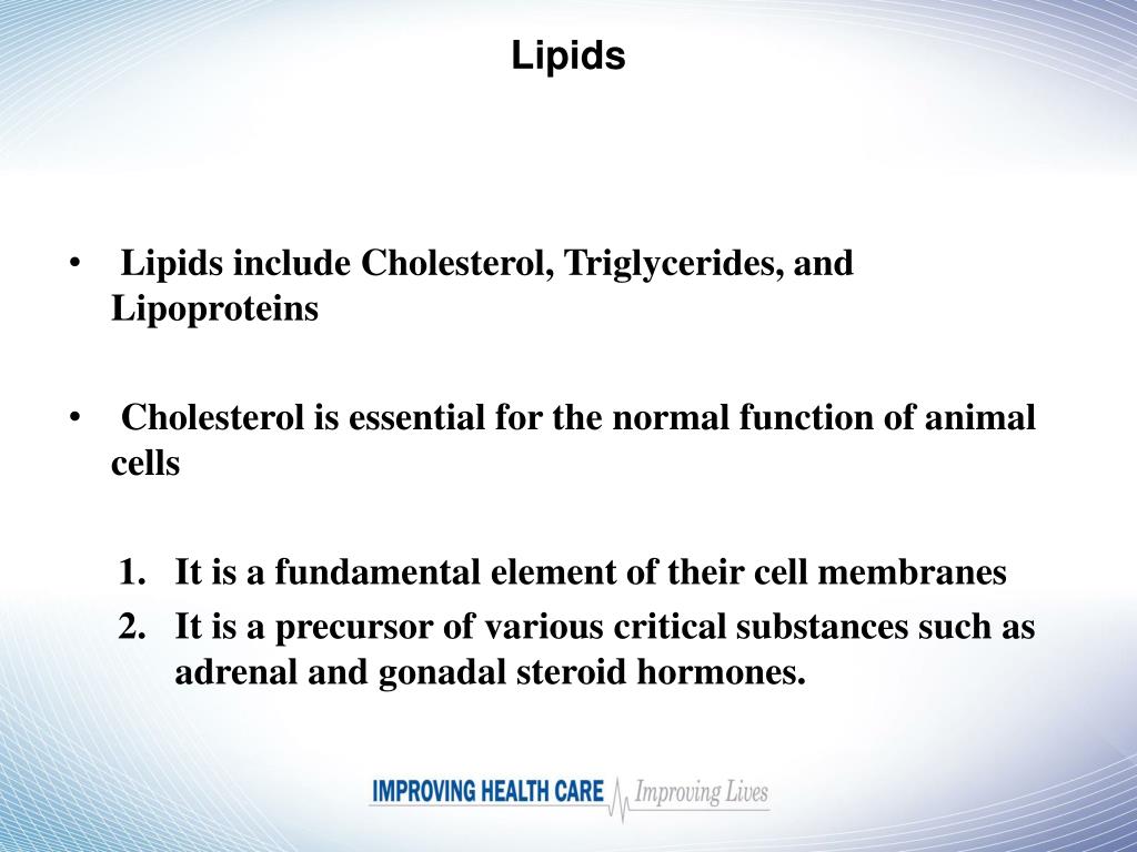 Lipids • Lipids include Cholesterol, Triglycerides, and Lipoproteins • Cholesterol is essential for the normal function of animal cells • It is a fundamental element of their cell membranes • It is a precursor of various critical substances such as adrenal and gonadal steroid hormones.