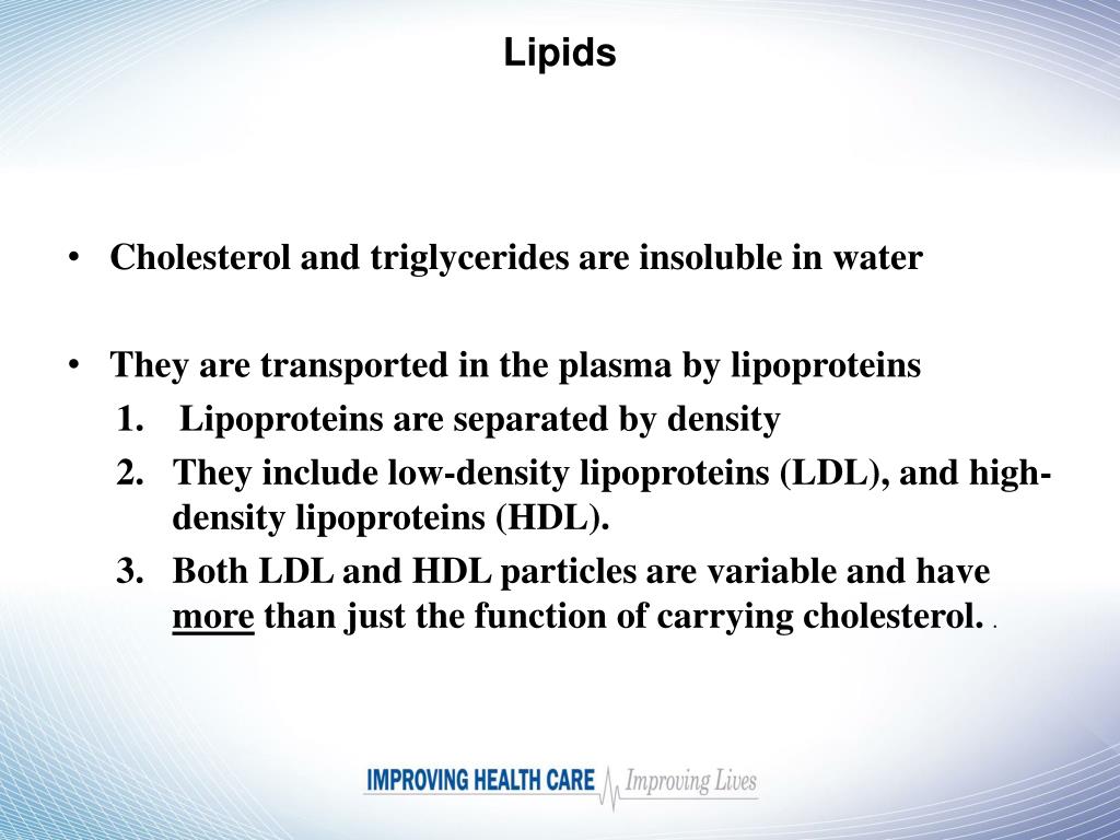 Lipids • Cholesterol and triglycerides are insoluble in water • They are transported in the plasma by lipoproteins • Lipoproteins are separated by density • They include low-density lipoproteins (LDL), and high-density lipoproteins (HDL). • Both LDL and HDL particles are variable and have more than just the function of carrying cholesterol. .