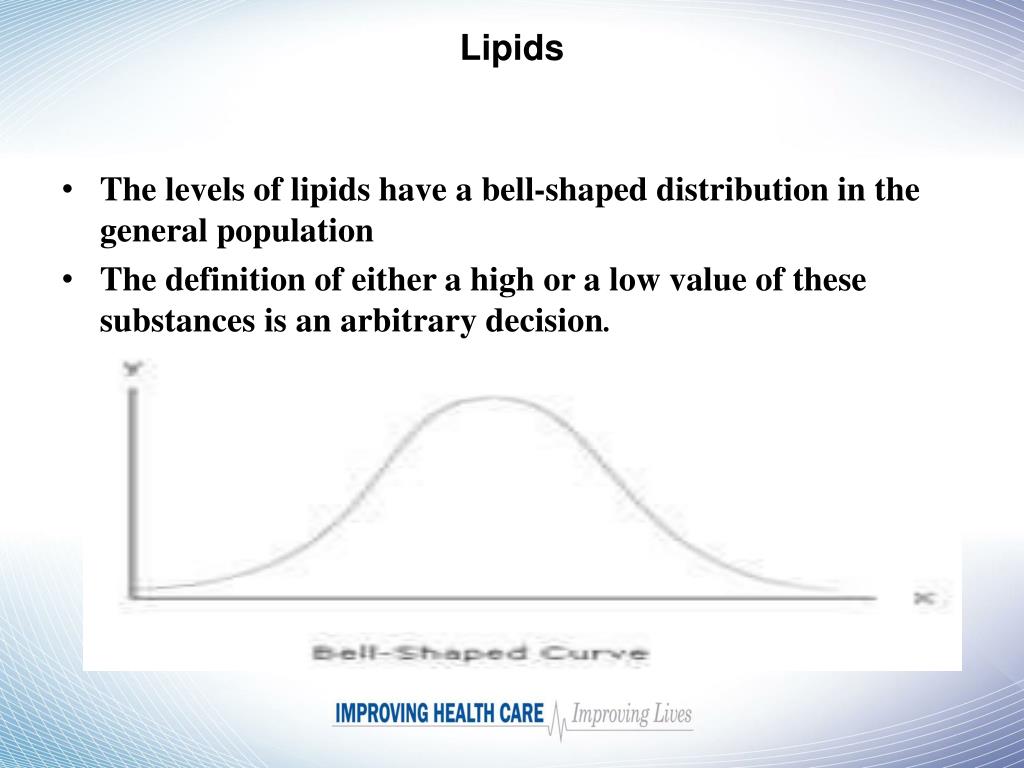 Lipids • The levels of lipids have a bell-shaped distribution in the general population • The definition of either a high or a low value of these substances is an arbitrary decision.