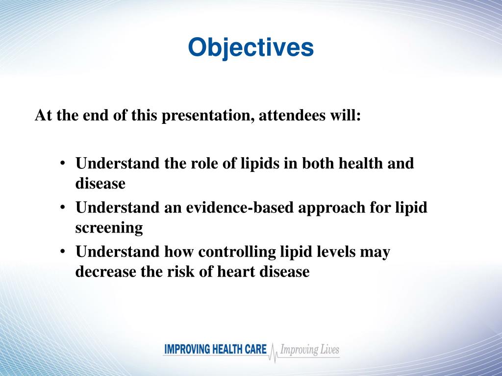 Objectives At the end of this presentation, attendees will: • Understand the role of lipids in both health and disease • Understand an evidence-based approach for lipid screening • Understand how controlling lipid levels may decrease the risk of heart disease