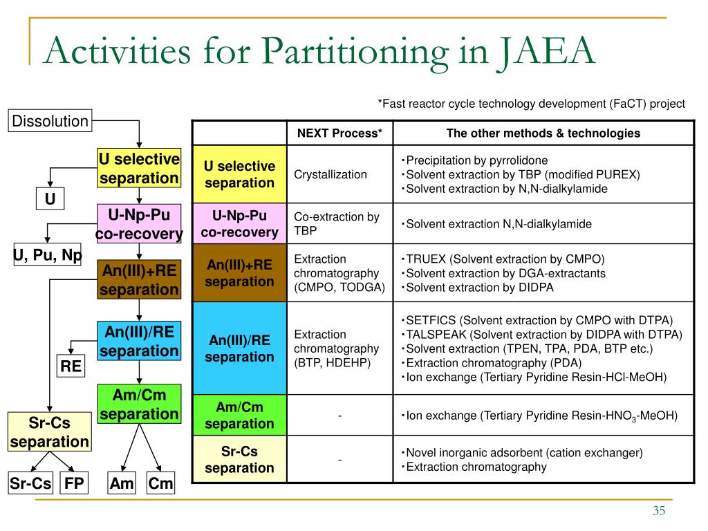 Activities for Partitioning in JAEA *Fast reactor cycle technology development (FaCT) project Dissolution U selective separation U U-Np-Pu co-recovery U, Pu, Np An(III)+RE separation An(III)/RE separation RE Am/Cm separation Sr-Cs separation Sr-Cs FP Am Cm