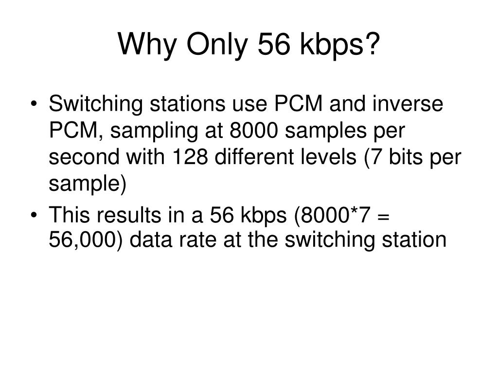 Why Only 56 kbps? • Switching stations use PCM and inverse PCM, sampling at 8000 samples per second with 128 different levels (7 bits per sample) • This results in a 56 kbps (8000*7 = 56,000) data rate at the switching station