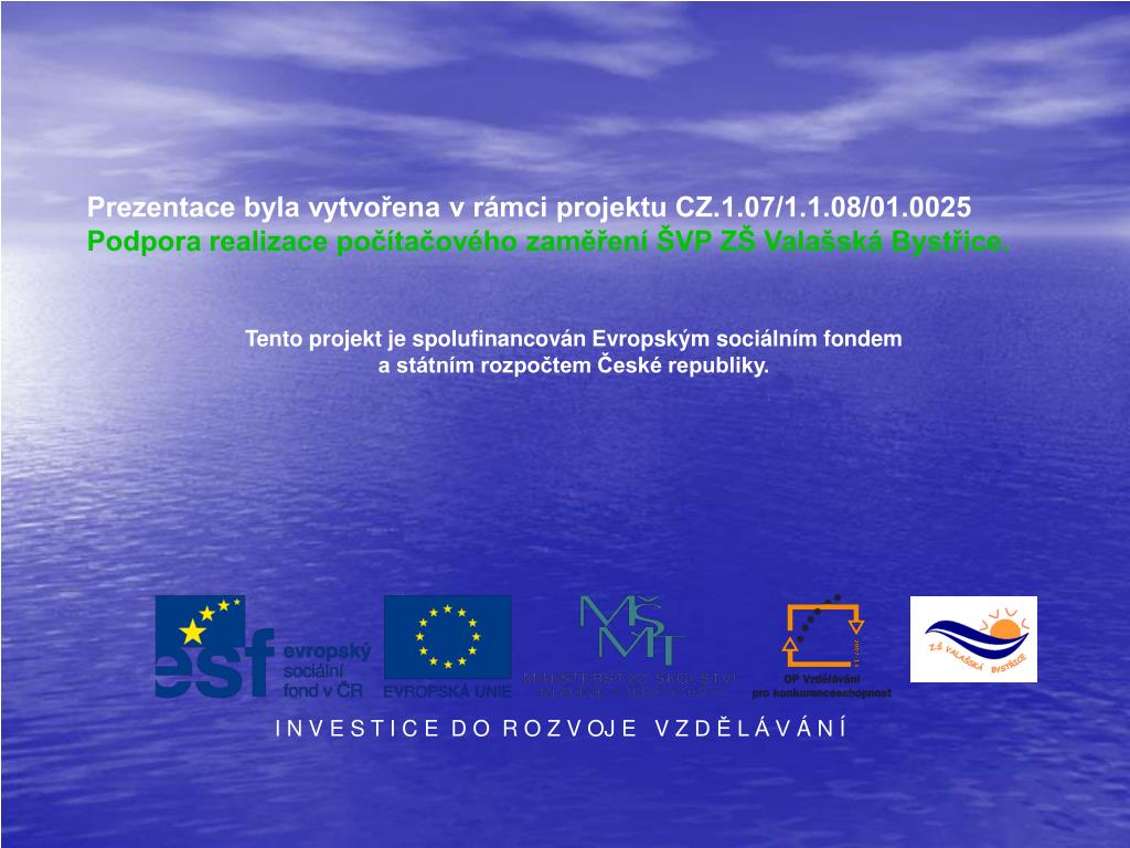 Prezentace byla vytvořena v rámci projektu CZ.1.07/1.1.08/01.0025 Podpora realizace počítačového zaměření ŠVP ZŠ Valašská Bystřice. Tento projekt je spolufinancován Evropským sociálním fondem a státním rozpočtem České republiky. I N V E S T I C E D O R O Z V OJ E V Z D Ě L Á V Á N Í