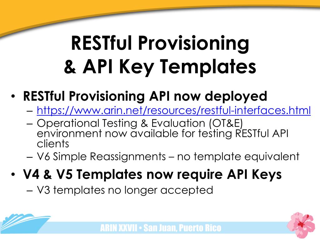 RESTful Provisioning & API Key Templates • RESTful Provisioning API now deployed • https://www.arin.net/resources/restful-interfaces.html • Operational Testing & Evaluation (OT&E) environment now available for testing RESTful API clients • V6 Simple Reassignments – no template equivalent • V4 & V5 Templates now require API Keys • V3 templates no longer accepted
