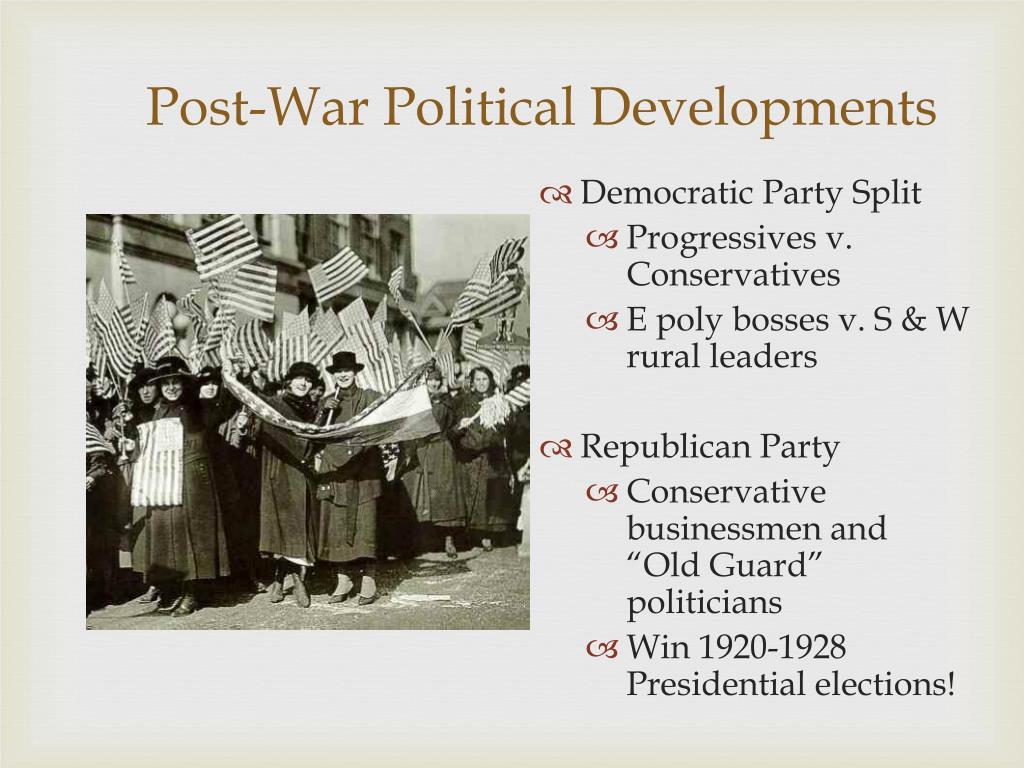 Post-War Political Developments • Democratic Party Split • Progressives v. Conservatives • E poly bosses v. S & W rural leaders • Republican Party • Conservative businessmen and “Old Guard” politicians • Win 1920-1928 Presidential elections!