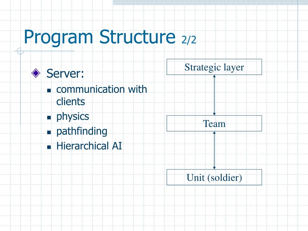 Server: communication with clients physics pathfinding Hierarchical AI Strategic layer Team Unit (soldier) Program Structure2/2
