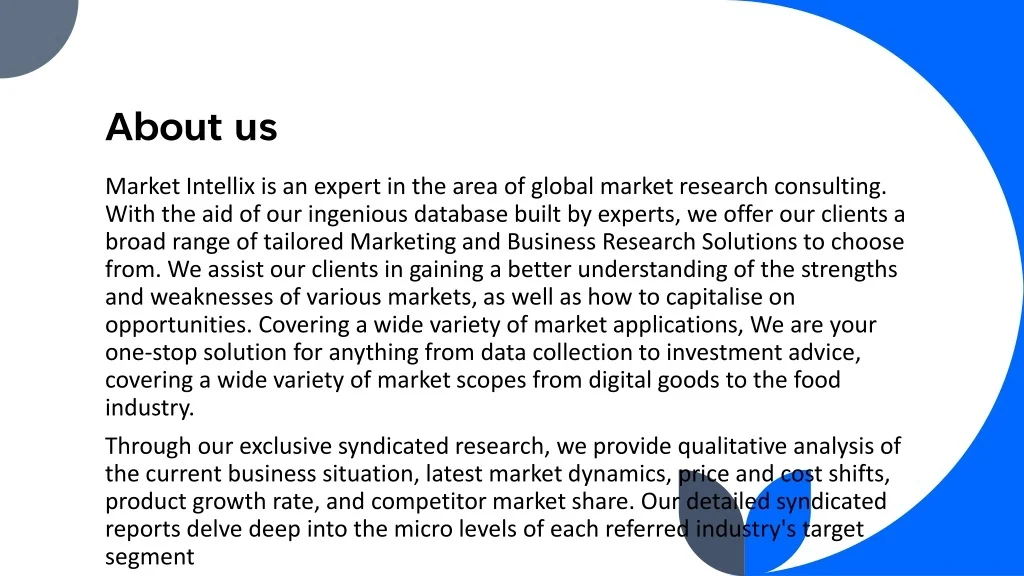 About us Market Intellix is an expert in the area of global market research consulting. With the aid of our ingenious database built by experts, we offer our clients a broad range of tailored Marketing and Business Research Solutions to choose from. We assist our clients in gaining a better understanding of the strengths and weaknesses of various markets, as well as how to capitalise on opportunities. Covering a wide variety of market applications, We are your one-stop solution for anything from data collection to investment advice, covering a wide variety of market scopes from digital goods to the food industry. Through our exclusive syndicated research, we provide qualitative analysis of the current business situation, latest market dynamics, price and cost shifts, product growth rate, and competitor market share. Our detailed syndicated reports delve deep into the micro levels of each referred industry's target segment