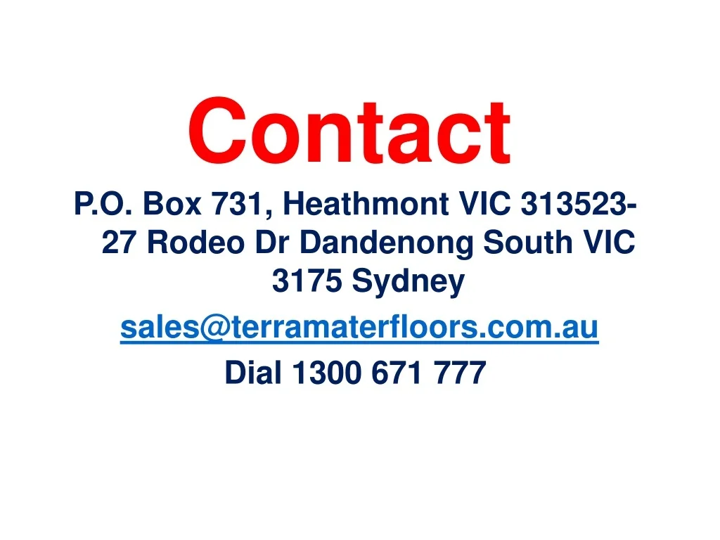 Contact P.O. Box 731, Heathmont VIC 313523-27 Rodeo Dr Dandenong South VIC 3175 Sydney sales@terramaterfloors.com.au Dial 1300 671 777