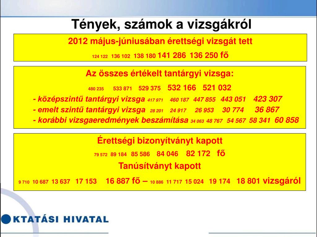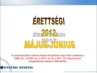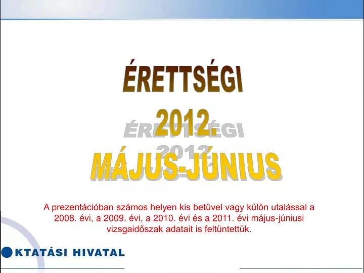 ÉRETTSÉGI 2012. MÁJUS-JÚNIUS A prezentációban számos helyen kis betűvel vagy külön utalással a 2008. évi, a 2009. évi, a 2010. évi és a 2011. évi május-júniusi vizsgaidőszak adatait is feltüntettük.