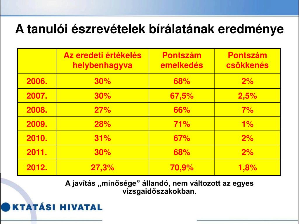 A tanulói észrevételek bírálatának eredménye A javítás „minősége” állandó, nem változott az egyes vizsgaidőszakokban.