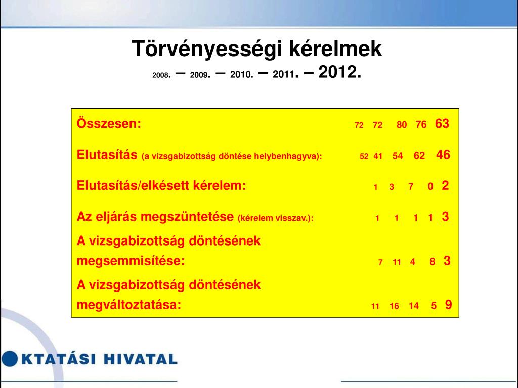 Törvényességi kérelmek2008.–2009.–2010. – 2011. – 2012. Összesen: 727280 76 63 Elutasítás(a vizsgabizottság döntése helybenhagyva): 52 4154 62 46 Elutasítás/elkésett kérelem: 1370 2 Az eljárás megszüntetése (kérelem visszav.):1111 3 A vizsgabizottság döntésének megsemmisítése: 711 48 3 A vizsgabizottság döntésének megváltoztatása: 111614 5 9
